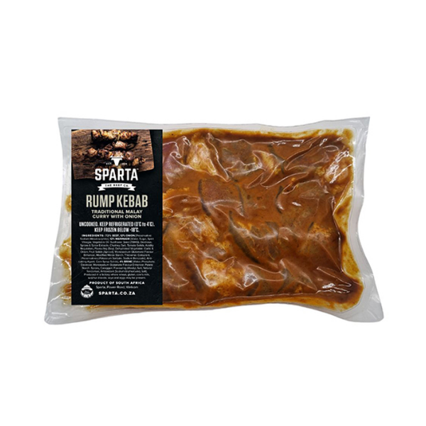 Labelling front: Sparta Traditional Rump Kebab with Cape Malay curry label.